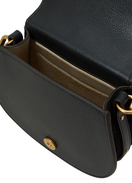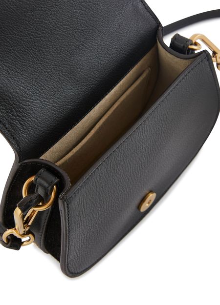• Description : Mini bag, slender, adjustable, detachable strap, interior pocket, calfskin leather, metal with an aged gold finish, flap closure, press stud fastener, worn in the hand, on the shoulder or crossbody.