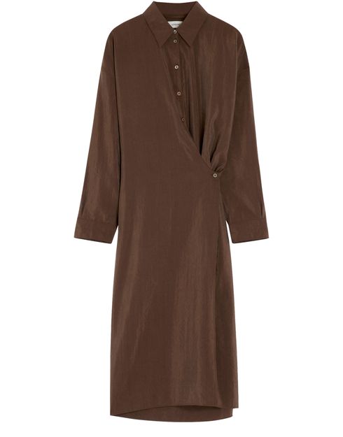 Introduce Lemaire's straight collar twisted shirt dress, a fashion-forward piece reimagined for modern elegance. The loose fit and cuffed long sleeves offer comfort with style. Its midi length and wraparound detail enhance its sophisticated silhouette, while the button fastening ensures a seamless fit.
