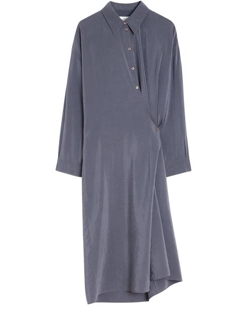 Introduce Lemaire's straight collar twisted shirt dress, a fashion-forward piece reimagined for modern elegance. The loose fit and cuffed long sleeves offer comfort with style. Its midi length and wraparound detail enhance its sophisticated silhouette, while the button fastening ensures a seamless fit.