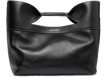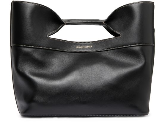 Alexander McQueen's Smooth leather bag features graphic cut-outs, handles, and a detachable strap for versatile wear. With a single compartment and detachable interior purse, it offers functionality and style. The front logo adds a touch of luxury. Hand carried, worn on the shoulder, or crossbody, it's a versatile and chic accessory.