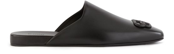 Discover Balenciaga's initial adorning classic lines with these Cosy BB leather mules, designed by the brand to be both elegant and comfortable.