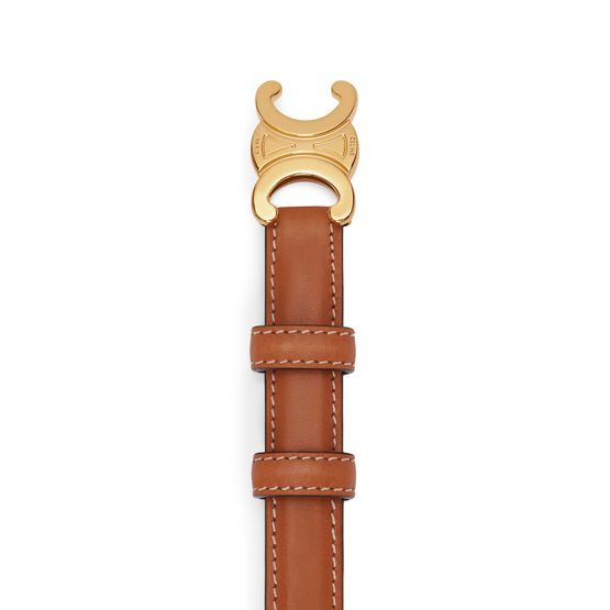 Celine's Triomphe small belt in natural calfskin is an exquisite accessory that elevates any ensemble. Its middle-waist design features a striking triomphe buckle adorned with a collar stud, while the luxurious gold finishing adds a touch of elegance. A perfect blend of sophistication and style, this belt is a must-have.