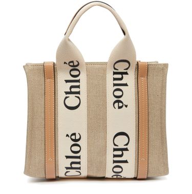 The Small Woody tote bag from Chloé features handles and a detachable strap for versatile carrying options. It is designed with Chloé lettering and an appliquéd logo, and has a single compartment with an interior patch pocket. The bag can be hand carried, worn on the shoulder, or as a crossbody with an adjustable shoulder strap. Height of handle: 11 cm and shoulder strap: 52...