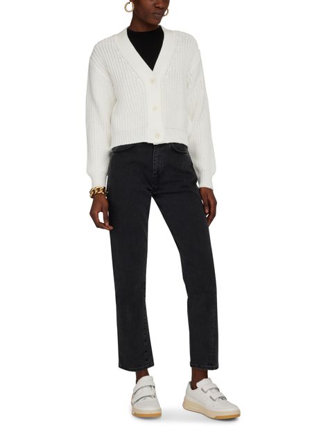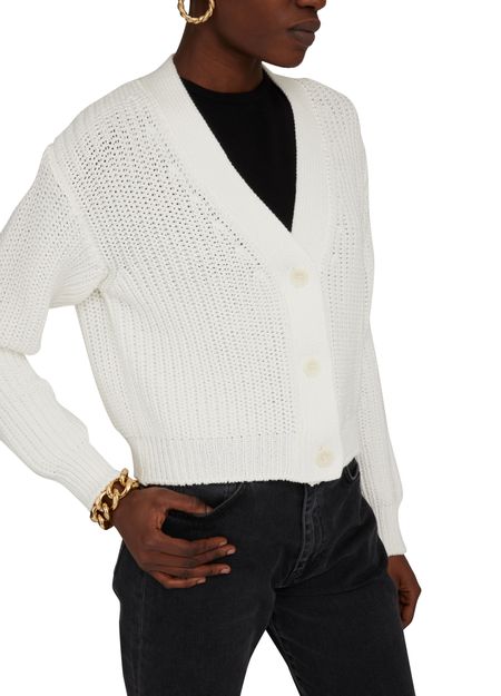 Max Mara's Yeti long-sleeved gilet offers a timeless and versatile addition to your wardrobe. With its loose fit and ribbed texture, this V-neck cardigan exudes effortless sophistication. The buttoned fastening adds a touch of elegance, making it the perfect piece to layer over any outfit for a chic and cozy look.