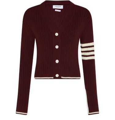 Thom Browne's 4Bar merino wool cardigan showcases a short, long-sleeved silhouette with a front buttoned closure for effortless style. Crafted from luxurious merino wool, it offers warmth and sophistication, making it a versatile piece for both casual outings and refined occasions. Elevate your wardrobe with this timeless essential.