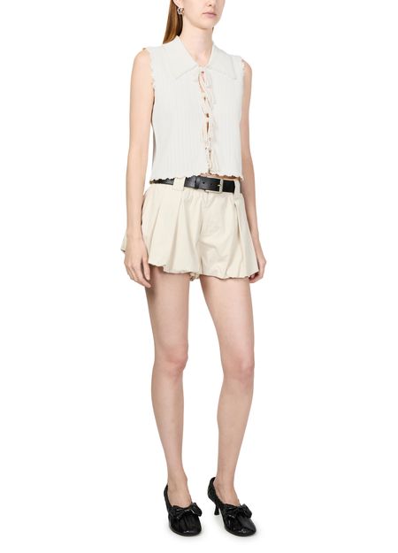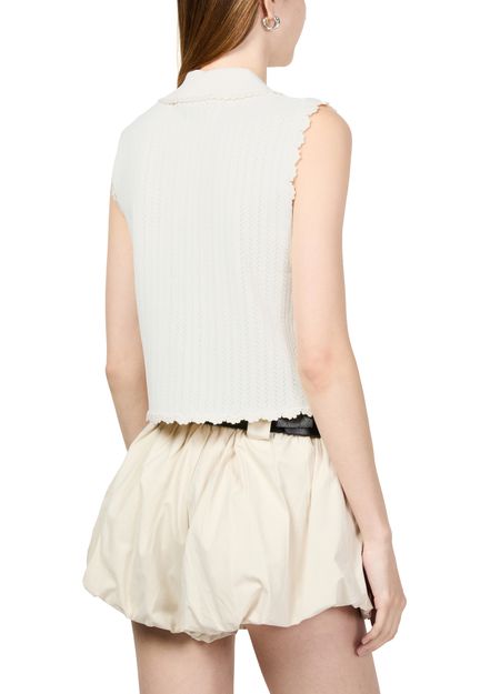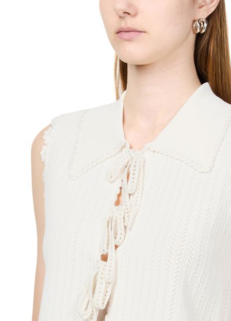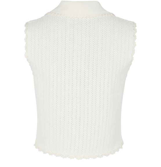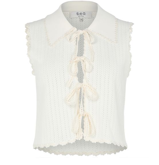 Unveil Sea New York Abbie knit vest, a sleeveless top offering a sophisticated loose fit. Its ribbed texture combined with a chic bow fastening creates an effortlessly stylish look. Perfect for layering, this piece transitions seamlessly from casual outings to elevated gatherings.