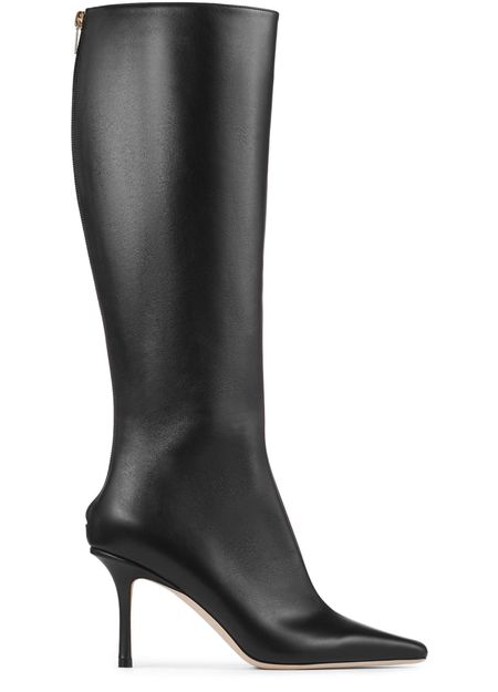 Jimmy Choo's Agathe Knee High Boot 85 is a stylish pair of boots crafted from smooth leather. With a high-top upper and a pointed toe design, these boots exude elegance and sophistication. The stiletto heel adds a touch of glamour, while the logo at the back subtly showcases the brand's luxury aesthetic.