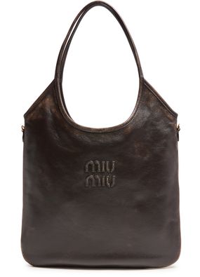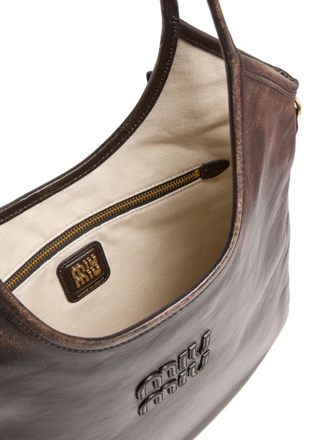 Reveal Miu Miu's aged nappa leather Ivy bag, crafted from distressed leather with a metallic Miu Miu logo. Double handles and a zippered interior pocket offer both style and practicality, while the contrast lining and antique metal finish add a refined, contemporary touch to this standout shoulder bag.