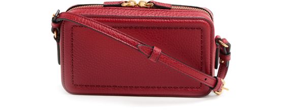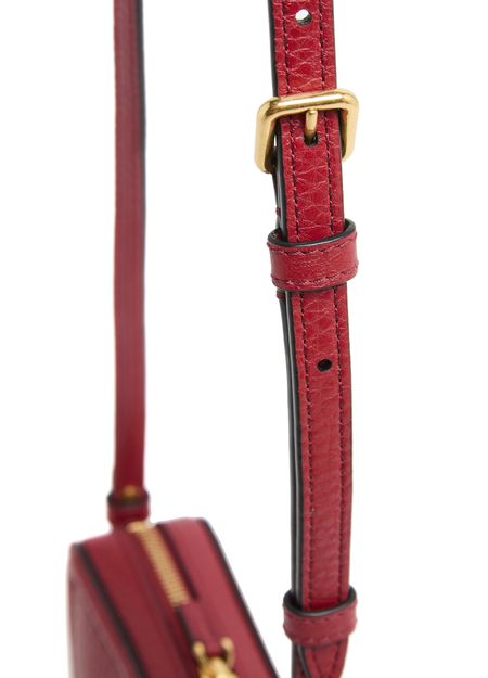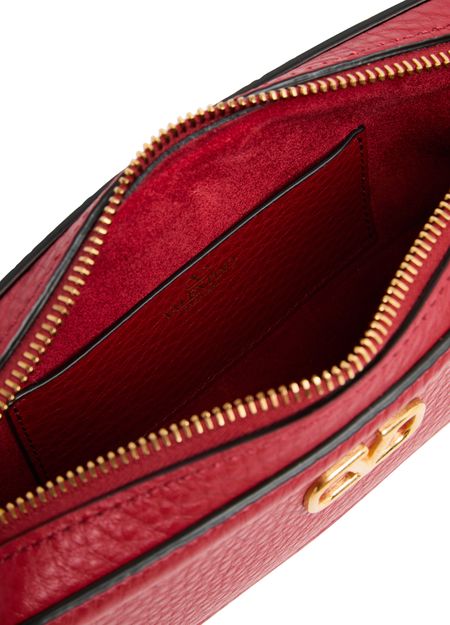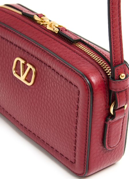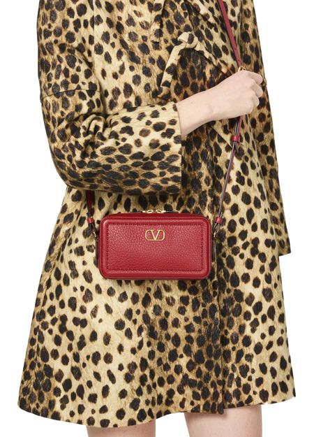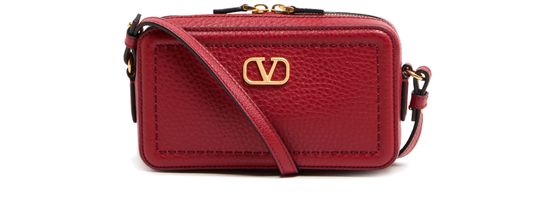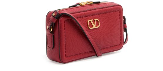 Valentino's Alltime mini camera case is a stylish companion for any adventure. With a zipper closure and single compartment, it keeps essentials secure. Its gold finish and metallic logo on the front exude elegance. The adjustable strap allows for a comfortable crossbody wear, while the thin strap and visible topstitching add a refined touch.