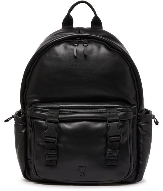 Ami's Ami de Cœur backpack features an embossed logo at the back and a metallic logo on the front. It is carried on the back with a wide strap for comfort. The backpack has a zipper closure and a zippered front pocket for easy access to essentials.