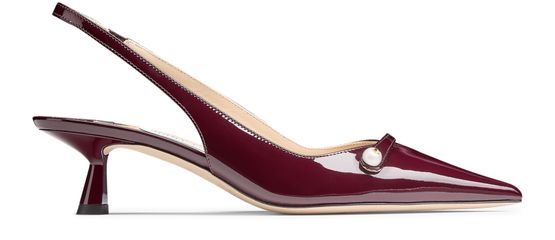 Unveil Jimmy Choo's Amita 45 pumps, crafted from patent leather with a sophisticated pointed toe and closed design. The medium stiletto heel and pearl-embellished ankle strap add a touch of elegance, while the visible stitching and leather outer sole ensure durability and style.