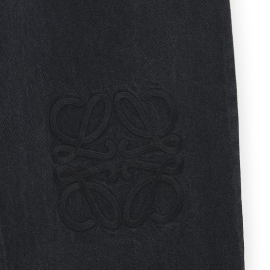 • Description : Embossed leather "Loewe" patch, embroidered logo, front logo, denim, high-waisted fit, two front pockets, back patch pocket, visible stitching, buttoned zipper closure, belt loops.