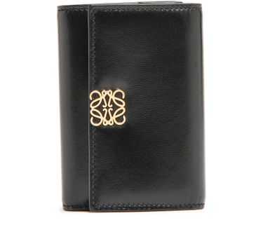 Loewe's Anagram Puffer leather vertical cardholder showcases a sleek design with a flap closure and visible topstitching. Its front logo in gold letters adds a touch of elegance, while the compact size ensures easy portability. Perfect for those who appreciate luxury and functionality in their everyday essentials.