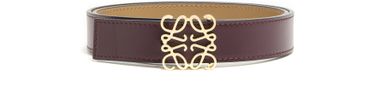 Loewe's Anagram reversible smooth calf leather belt showcases exquisite craftsmanship with its luxurious leather and gold-tone hardware. The striking logo buckle, adorned with the logo in gold letters, adds a touch of sophistication. Versatile and stylish, this belt effortlessly elevates any outfit, making it a must-have accessory for discerning fashion lovers.