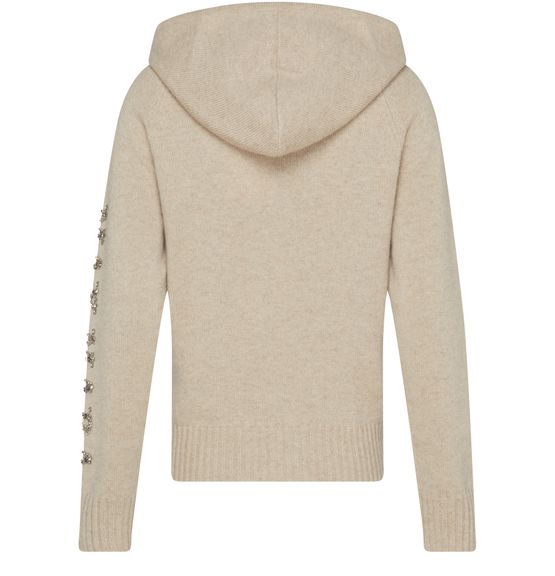 • Description : Knit sweater, straight cut, ribbed, hood, adjustable drawstring neckline, long raglan sleeves, logo on the side, gold finishes.