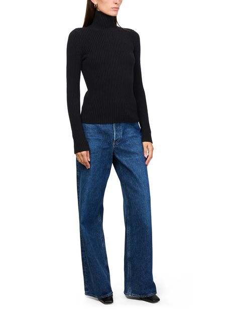 Reveal Max Mara's ribbed turtleneck sweater, a masterpiece in knitwear. This slim-fit design features a back zipper closure and long sleeves, offering a sleek silhouette. The ribbed texture adds depth, making it perfect for both casual and formal settings. Pair it with tailored trousers or a chic skirt for a refined look.