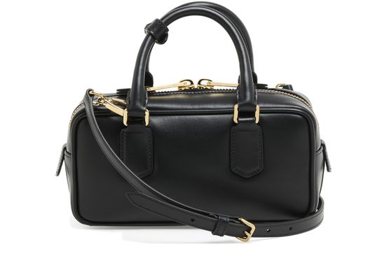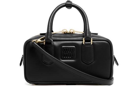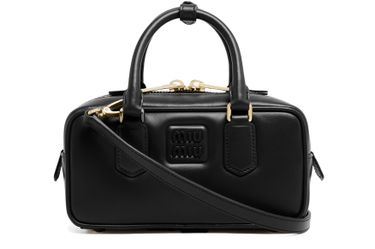 Reveal Miu Miu's Arcadie leather bag, a masterpiece of modern design. Crafted from smooth leather, this mini bag features a sleek zipper closure and an embossed logo. The adjustable, detachable strap offers versatile styling, while the large interior compartment ensures practicality. Elevate your ensemble with this chic accessory.