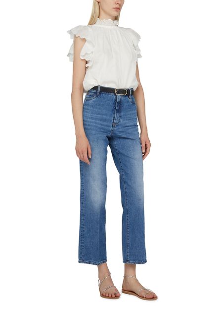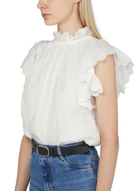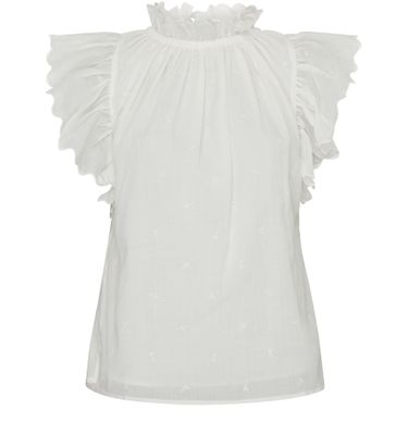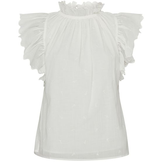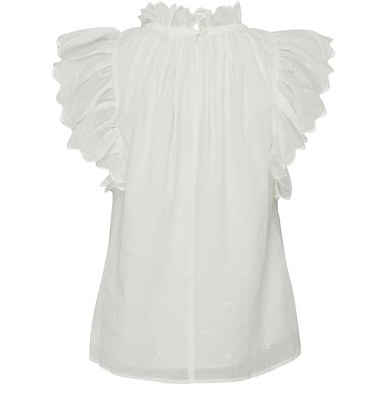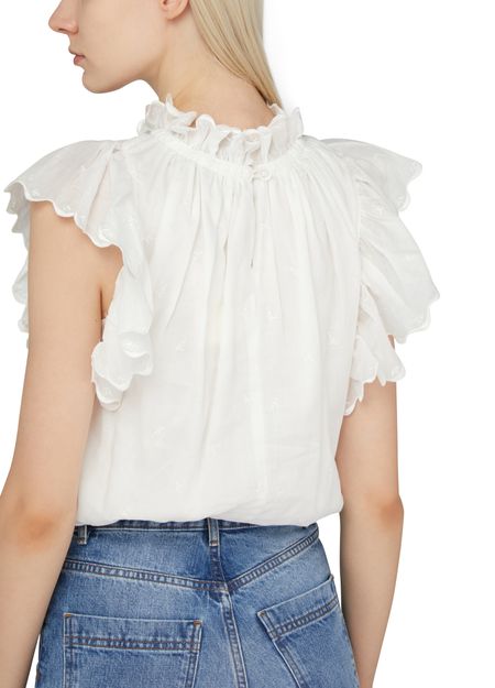 Description : short-sleeved, logo at the back label, mockneck, back buttoned fastening, ruffle details, sleeve details, embroidered details, floral embroidery, all-over embroidery, ruffled sleeve.