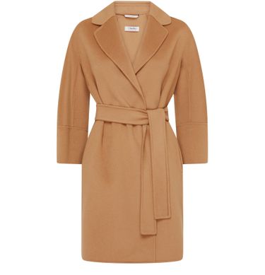 S Max Mara's Arona belted coat showcases a knee-length silhouette with long sleeves and a stylish notched collar. Its practical side pockets add functionality, while the belted waist enhances your figure. A chic logo at the back label signifies quality, making this coat a timeless addition to any wardrobe.
