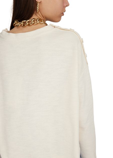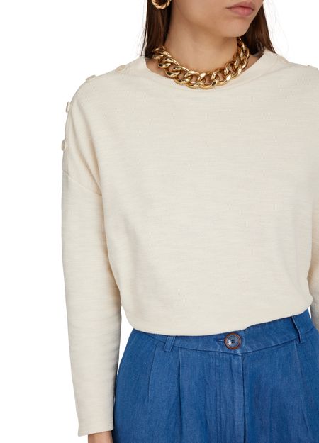 Sessùn's Austin sweater showcases a loose fit with a stylish boatneck that elegantly frames the neckline. Its dropped sleeves and long sleeves create a relaxed silhouette, while buttons on the shoulder add a touch of sophistication. Perfect for layering, this piece effortlessly combines comfort with chic design for any occasion.