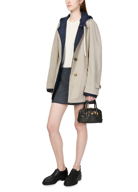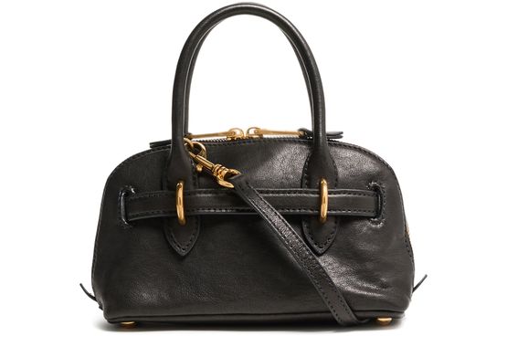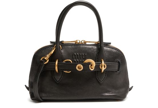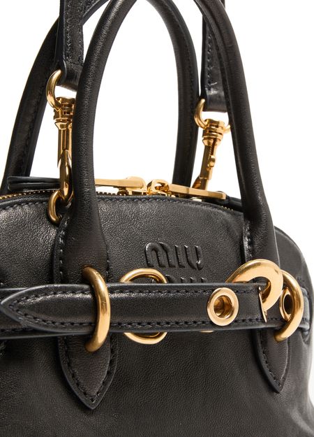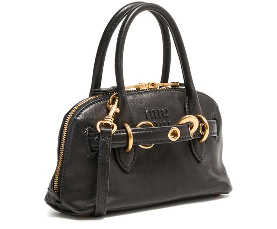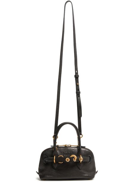 Miu Miu'sAventure mini nappa leather handbag showcases a chic design with a zipper closure and a single compartment for essentials. Its gold finish and metallic logo on the front add elegance, while interior patch pockets enhance functionality. Hand carried or worn crossbody with a detachable strap, this mini bag is a stylish statement.