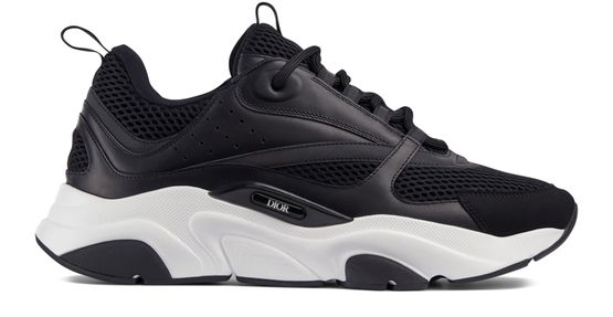 The B22 sneaker takes inspiration from retro running styles. The chunky low-top silhouette is defined by a calfskin and mesh-paneled upper set on a sculpted white and black rubber sole. The black mesh tongue and heel counter are complemented by black laces, while an embossed 'DIOR' signature adorns the side. The sneaker can be contrasted with tailored suiting to add a fashionable sportswear touch.