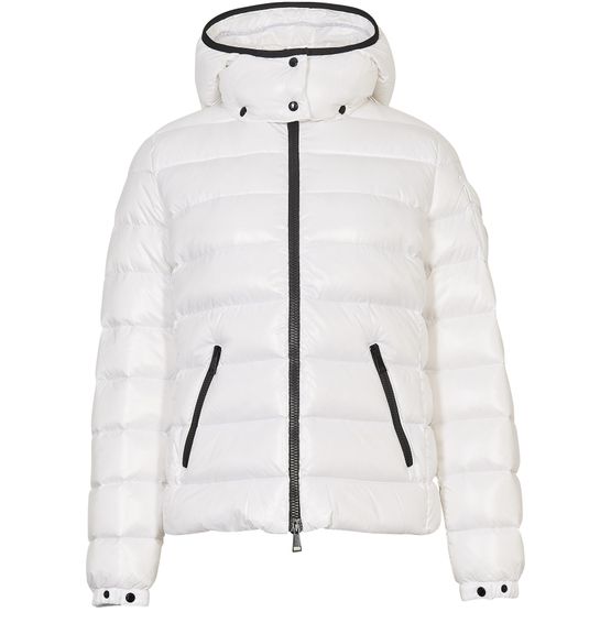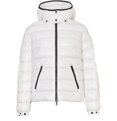 Moncler's Bady down jacket is a hooded puffer jacket with a quilted design. It has a fitted shape with a high neck collar and long sleeves with cuffs. This jacket features two zippered front pockets and a zipper fastening for easy closure. It is stylish, warm, and perfect for cold weather.