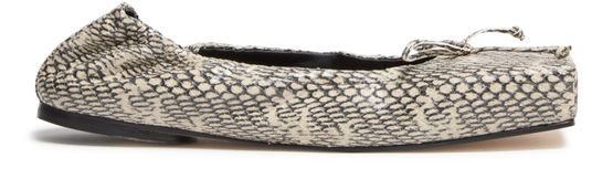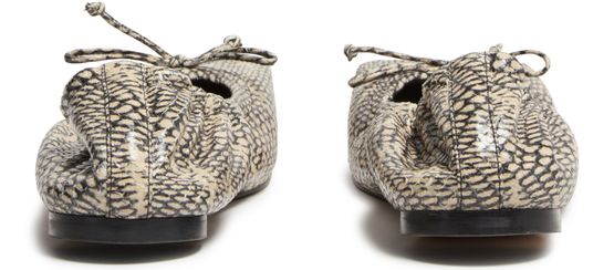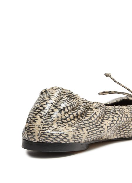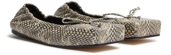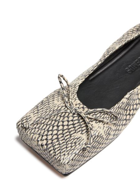 Reveal Jacquemus's Ballet Pumps, where snakeskin print leather meets modern elegance. These pumps feature a chic square toe style and a flat heel, enhanced by an engraved logo for added sophistication. The laces and strap closure ensures a secure fit, while visible stitching adds a touch of crafted artistry.
