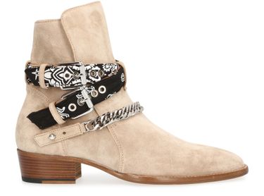 Amiri presents a bold creation with a unique set of textures. These bandana buckled ankle boots have a distinctive elegance, with a metal chain and riveted clasp.