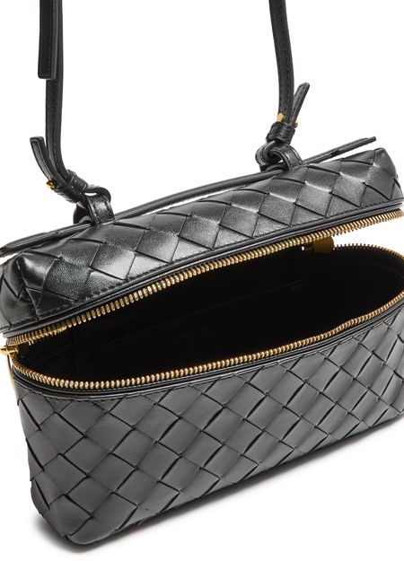 • Description : Crossbody bag, intrecciato weaving technique, single handle, leather handle, thin strap, adjustable strap, zipper closure, zippered interior pocket, gold finish.