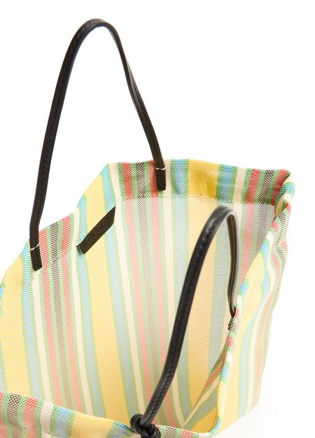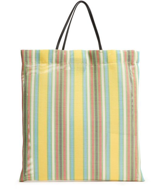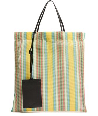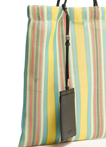 Reveal The Row's Barn mini tote bag, a sleek addition to any wardrobe. The bag boasts a striped print with visible topstitching, exuding sophistication. Double handles ensure comfortable carrying, while its functional design complements your every look effortlessly.