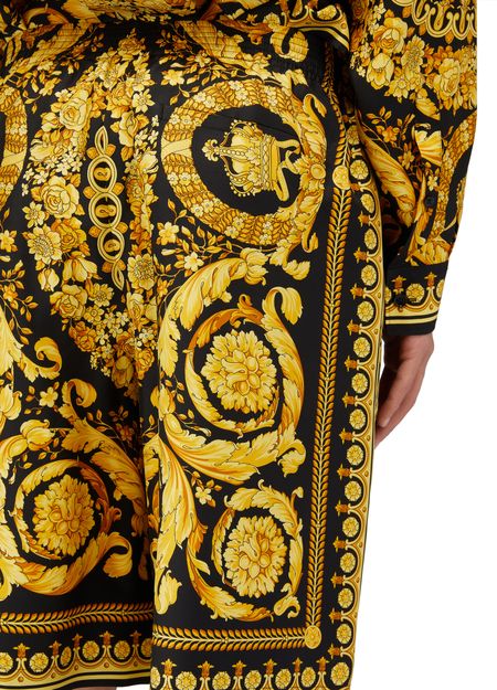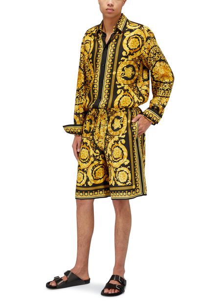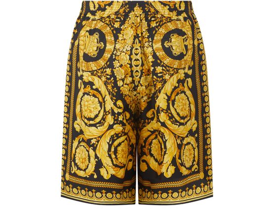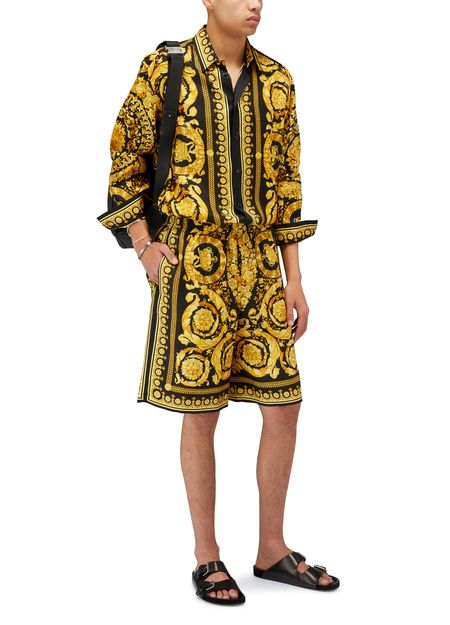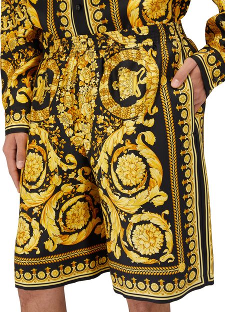 Versace's Barocco Print Shorts offer a stylish long shorts design with a straight cut that flatters any figure. The elasticated waist ensures a comfortable fit, while the printed fabric showcases the brand's emblematic pattern, making a bold statement. Elevate your wardrobe with these iconic shorts that blend luxury and leisure.