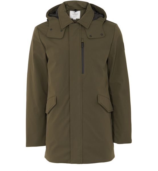 Woolrich's Barrow Mac Softshell Coat is a versatile three-quarter length coat with a straight cut design. It features a hood, mockneck, and long sleeves for added protection from the elements. The coat includes zipped pockets, flap pockets, and a concealed zipper and snap fastening for practicality and style.