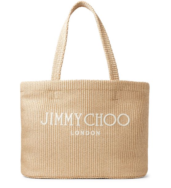 Reveal Jimmy Choo's beach tote bag, a masterpiece of open weave craftsmanship. This tote, adorned with a front logo, features double handles and visible topstitching, embodying both style and functionality. Perfect for those who appreciate elegance and practicality in their accessories.