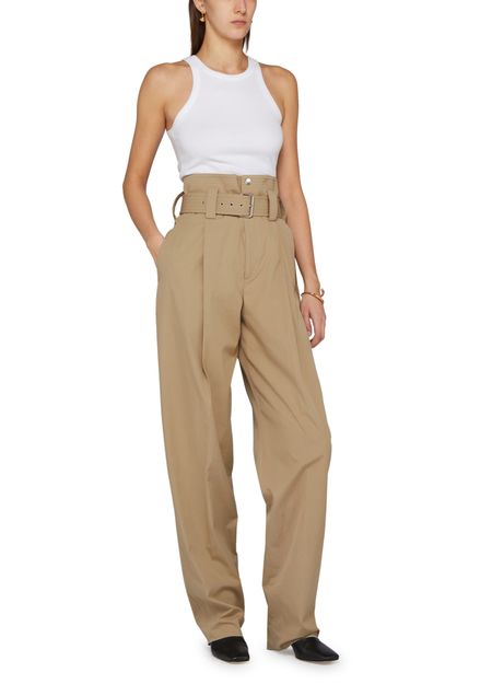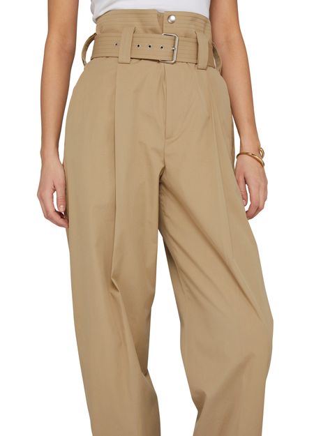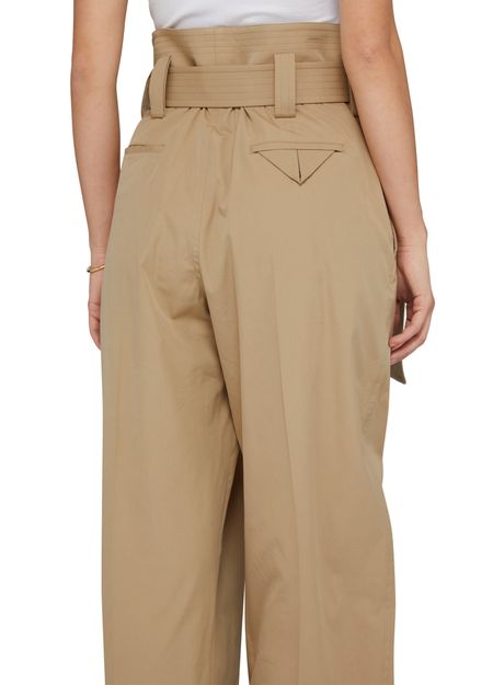 Discover Bottega Veneta's Belted cotton pants, designed with a high-waisted fit and a loose silhouette. Featuring a buttoned and concealed zipper closure, belt loops, and a triangle logo, these ankle-length casual pants offer welt pockets and a back pocket, highlighted by visible stitching for a refined touch.