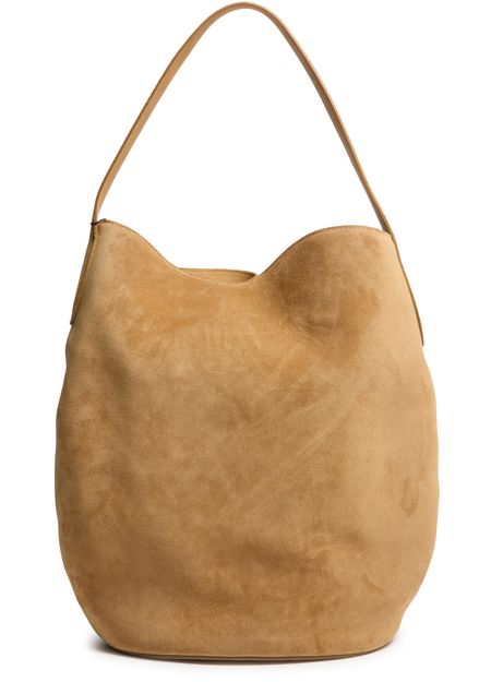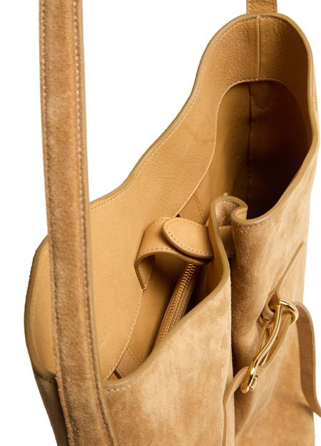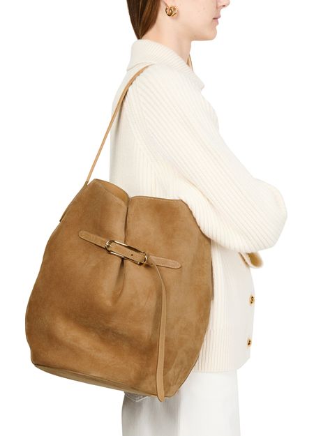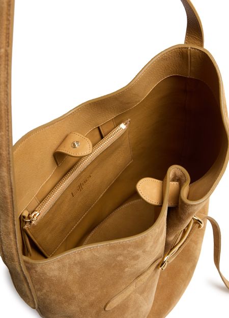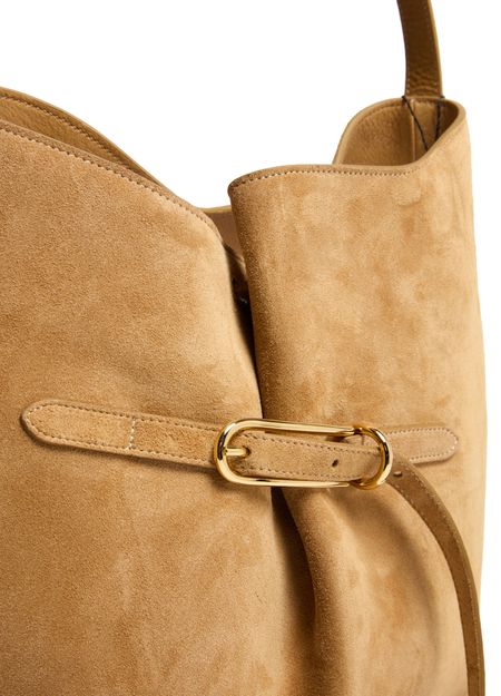 Reveal Liffner's belted large bucket bag, crafted from sumptuous suede with a single handle for effortless carrying. The gold finish hardware and contrast stitching highlight its refined design, while a spacious interior and zippered pocket offer practical elegance for modern lifestyles.