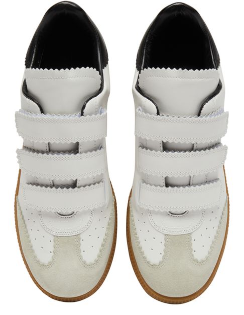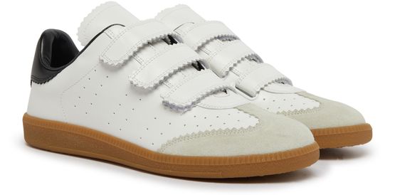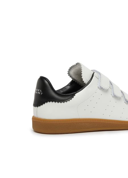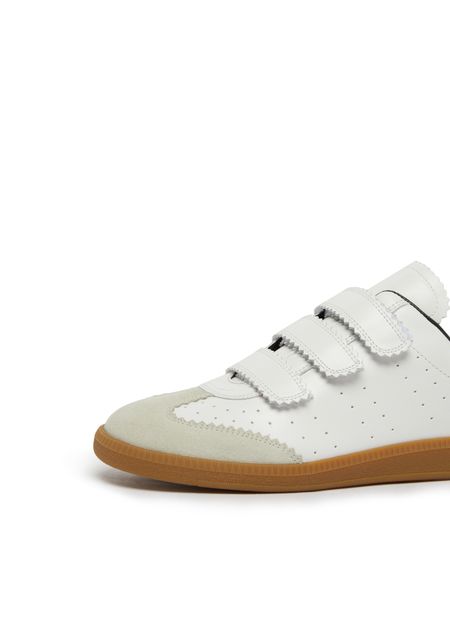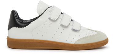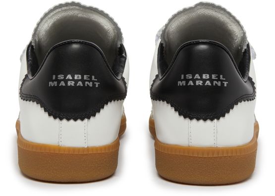 Isabel Marant's Beth sneakers are a stylish and modern pair of leather sneakers. They feature a round toe and graphic cut-outs for a trendy look. The logo heel adds a touch of branding, while the Velcro fastening allows for easy on and off. The contrasting sole adds a unique finishing touch.