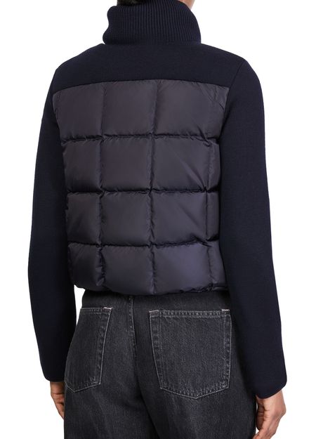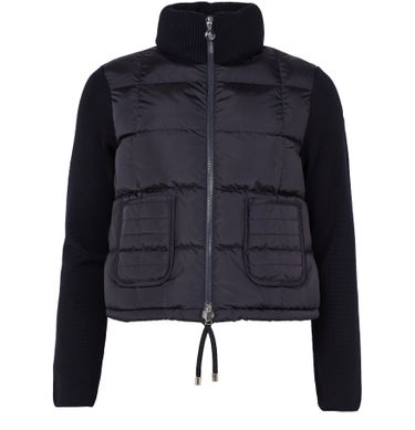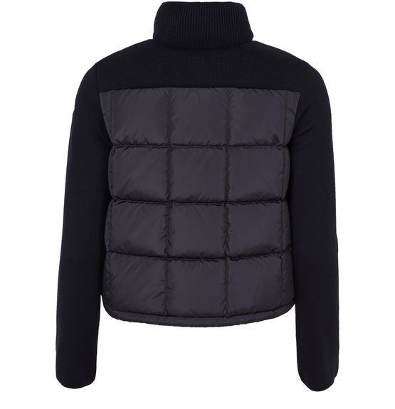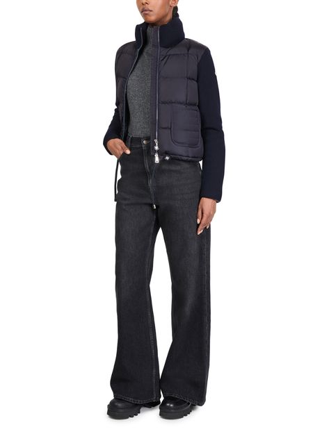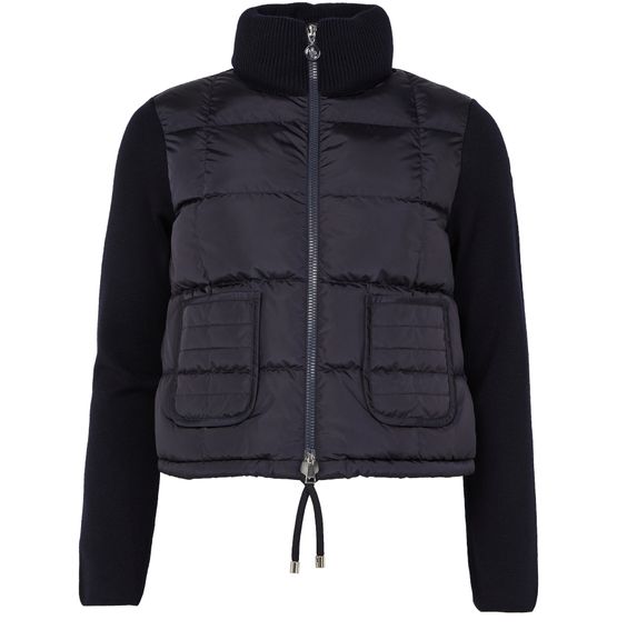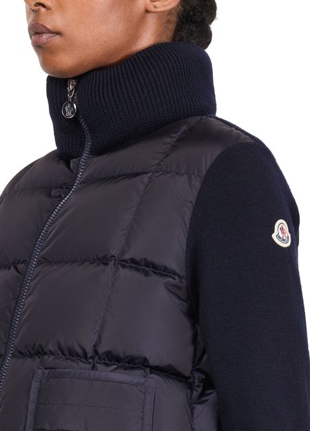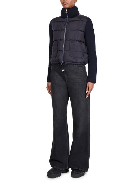 Introducing Moncler's bi-material jacket, an epitome of modern elegance. This long-sleeved piece features a sleek zipper closure that enhances its polished silhouette. Crafted with a distinctive blend of materials, it provides both warmth and style. Perfect for versatile styling, Moncler's creation seamlessly transitions from casual to refined settings.