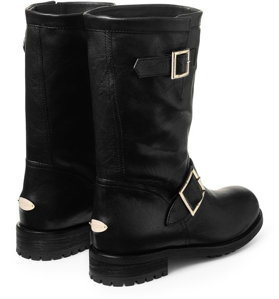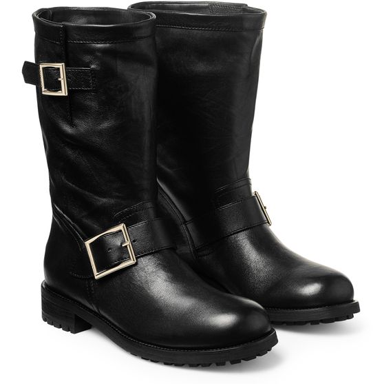 Reveal Jimmy Choo's combat boots, crafted from smooth leather with a low block heel and a round closed toe. The notched thick sole and buckled strap closure ensure both comfort and edge, while the gold-finish signature buckle and engraved logo at the back add a refined, recognizable touch.