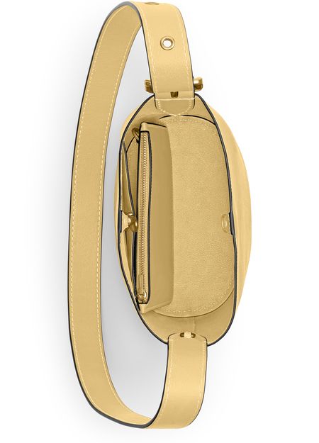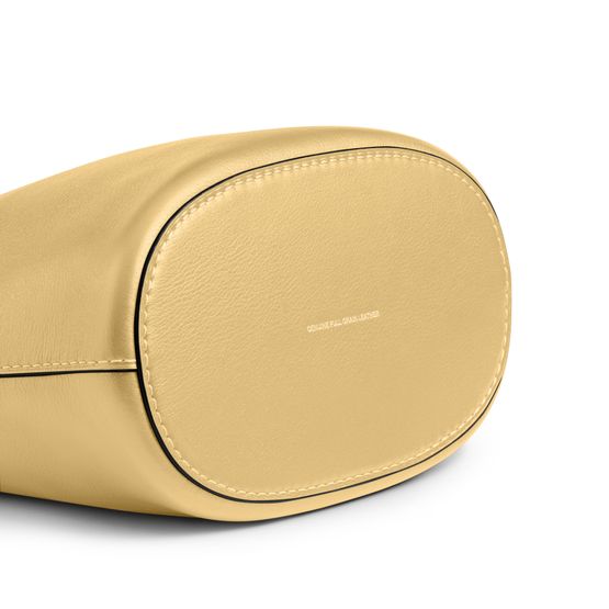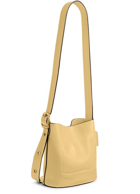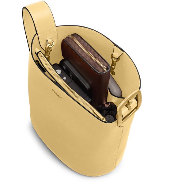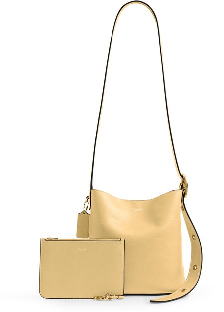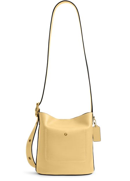 Reveal Coach's crossbody bucket bag, a modern statement with a decorative label featuring the embossed Coach logo. The thin, adjustable strap and visible stitching add refined detail, while the gold-finish hardware and front logo in gold letters elevate its sophisticated appeal for everyday versatility.