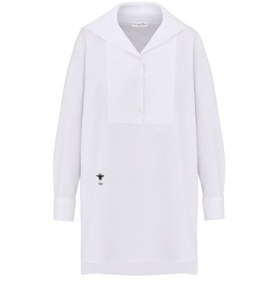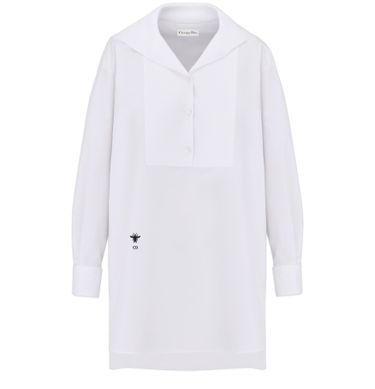 Embrace Dior's blouse with sailor collar, showcasing the brand's embroidered hallmark bee and CD signature. Crafted with exquisite mother-of-pearl buttons, this unlined piece is made from 100% cotton, reflecting Italian craftsmanship at its finest.