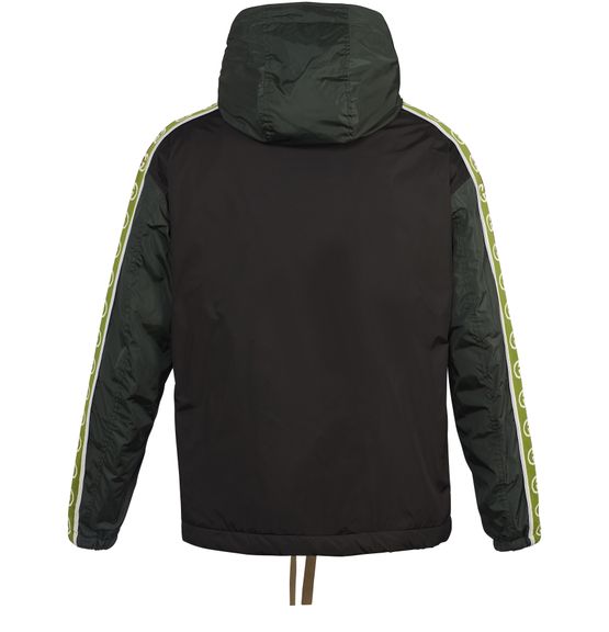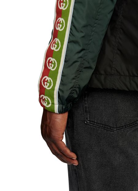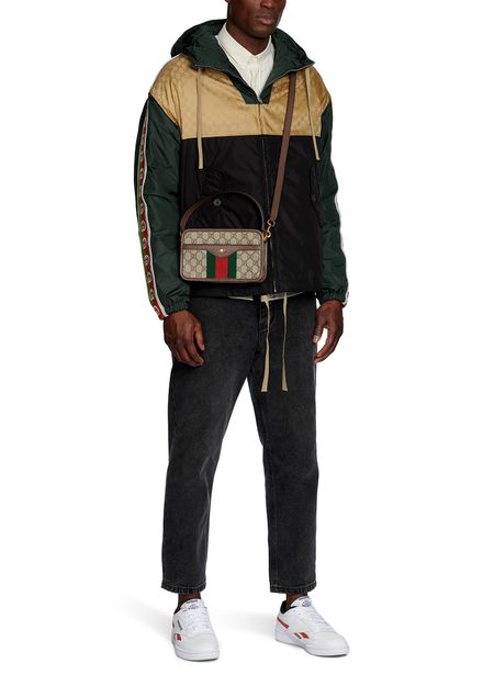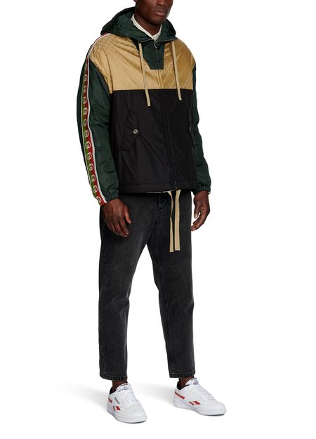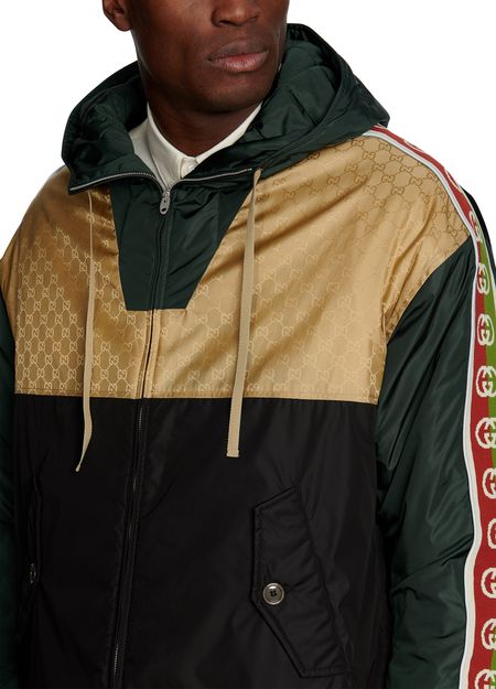 The indelible imprint of the retro style blends with the classic Gucci brand symbols to create this sporty logo jacket. Featuring a hood, this jacket for men will protect you completely from the cold and rain. And along the sleeves, the logo presented in a combination of the Italian brand's distinctive colours will lend you a contemporary touch.