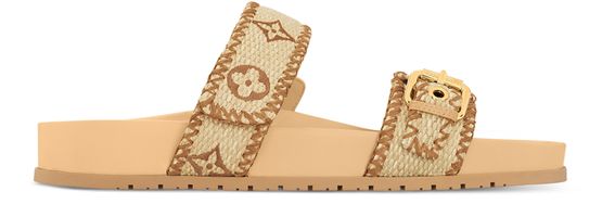 The Bom Dia flat comfort mule is revisited this season in raffia embroidered with the Monogram pattern. It brings a refined, artisanal dimension to this easy-to-wear style, which features a comfortable anatomic insole and lightweight rubber outsole. The front strap is adjusted with an engraved, gold-tone buckle, while the other fastens with velcro.