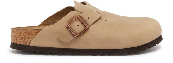 Birkenstock Original's Boston BS mules showcase a timeless design with a wide buckled strap and a round toe that ensures comfort. The engraved logo adds a touch of elegance, while the logo-printed insole provides support. Perfect for any occasion, these closed mules effortlessly blend style and practicality.