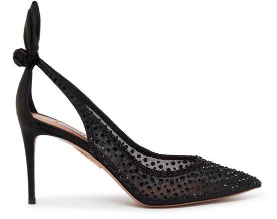 Aquazzura's Bow Tie crystal tulle pumps 85 showcase a stunning blend of elegance and sophistication. With their high stiletto heel and pointed toe, these pumps feature visible stitching and a contrasting sole, creating a striking silhouette. The closed design adds allure, making them perfect for any glamorous occasion.