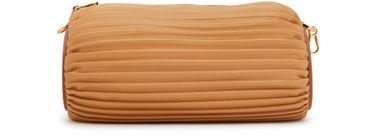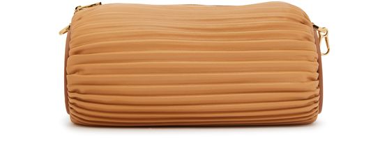 Loewe's Bracelet Pouch bag is a chic accessory with an embossed logo on the side. It has a zipper closure and a thin strap for wearing on the shoulder or crossbody. The gold finish adds a touch of luxury, while the detachable strap and carabiner provide versatility in styling options.