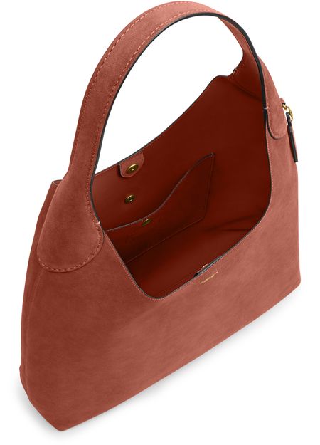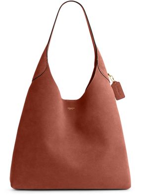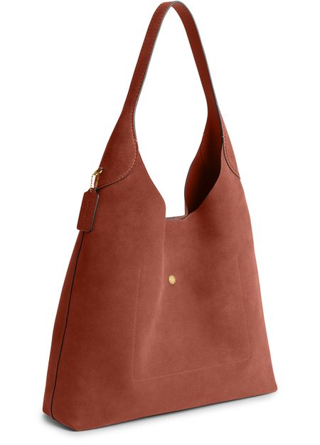 Reveal Coach's suede shoulder bag, a refined hobo silhouette featuring a single handle and visible stitching. The gold-finish hardware and front logo in gold letters add a sophisticated touch, while the decorative label with embossed Coach logo highlights the brand’s signature craftsmanship.