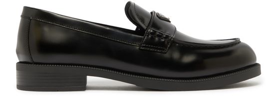 Prada's Brushed leather loafers showcase a refined design with a round toe and low block heel. The triangle logo adorns the front, complemented by visible stitching that highlights craftsmanship. A logo-printed insole adds a touch of luxury, making these loafers the perfect choice for effortless elegance in any setting.