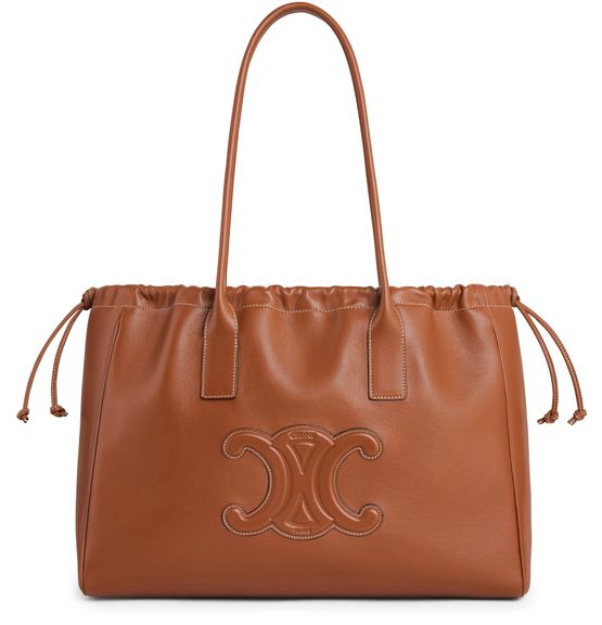 Celine's cabas Drawstring cuir Triomphe in smooth calfskin is a stylish shoulder bag designed for effortless elegance. With a single compartment secured by a drawstring closure, it combines functionality with sophistication. The front logo adds a touch of refinement, and the thin strap ensures comfortable wear for any occasion.