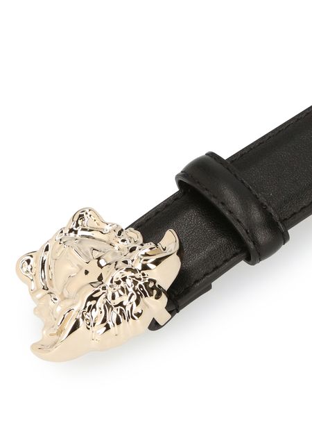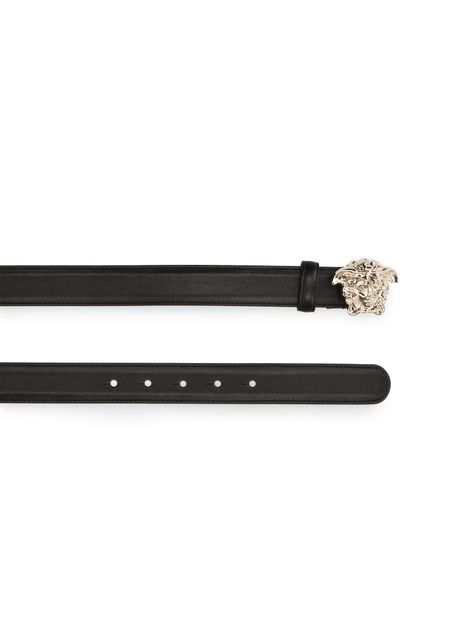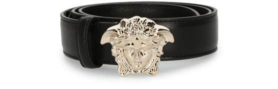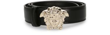 Versace presents this calfskin leather belt. This solid-color accessory is enhanced by a metal Medusa buckle. A timeless belt; the perfect way to enhance your casual looks.